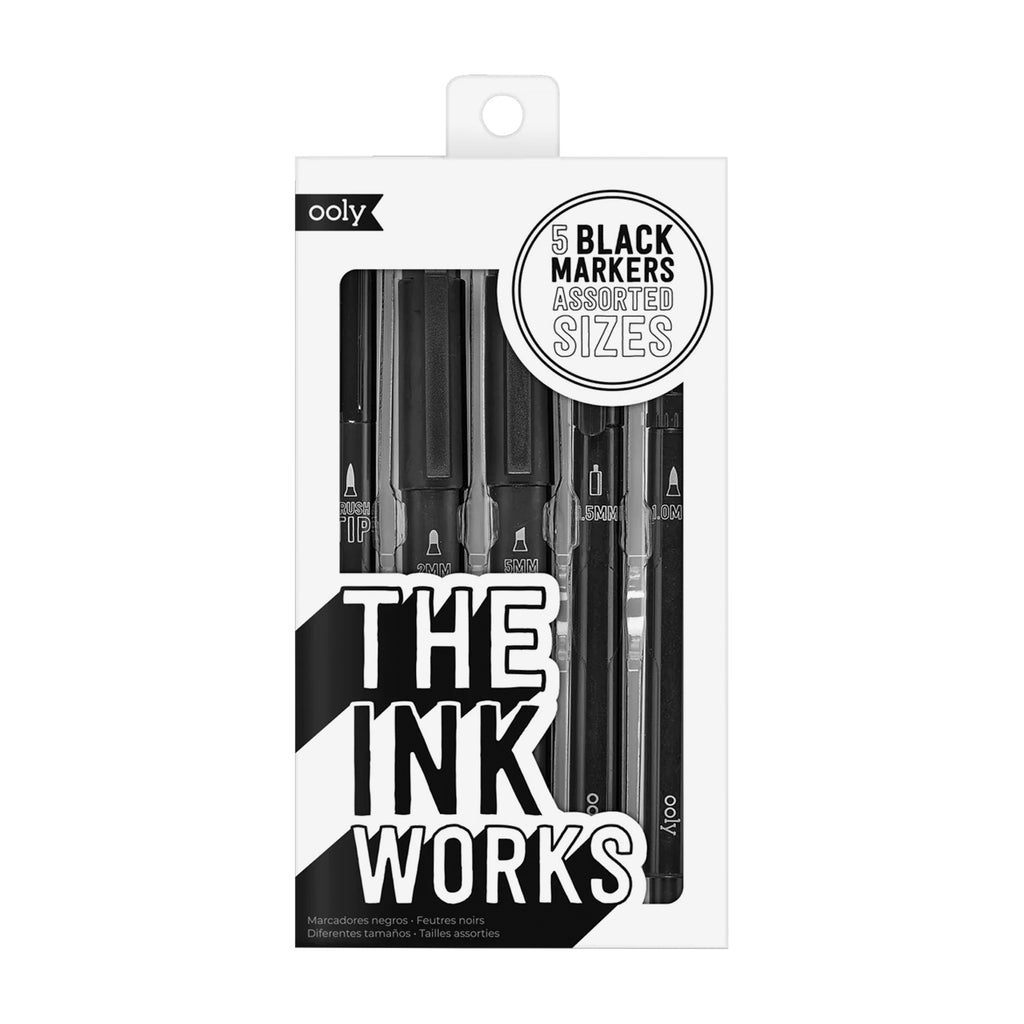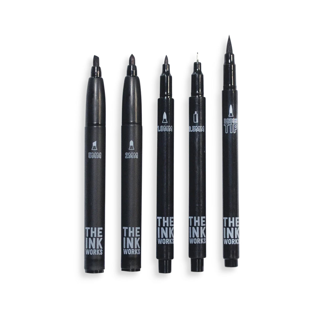 This marker set is for all the artists out there who work in black ink - finally, a single set of every marker you need. The Ink Works Markers is a complete set featuring 5 black ink markers, each with a different type of tip. Create anything from masterful calligraphy, beautifully artistic brush strokes, and even highly detailed sketches and fine writing. In the set you'll find a 5mm chisel tip, a 2mm rounded tip, a fine brush tip, a 1.0mm tip and an ultra fine 0.5mm ultra fine tip...