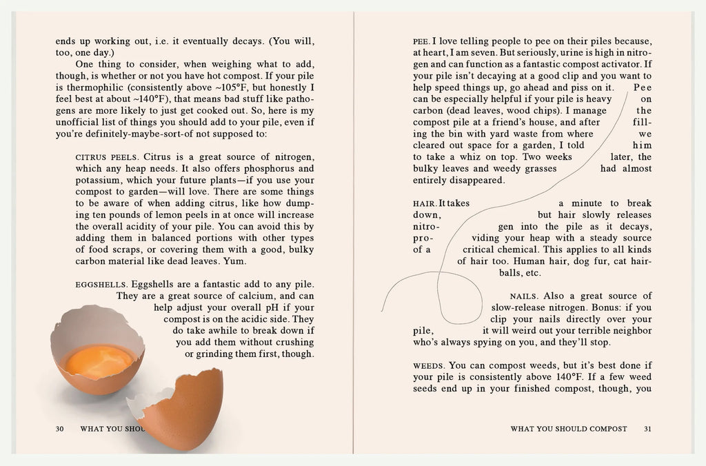 Compost This Book is an essential introduction to composting for beginners. Author Cassandra Marketos, drawing on her extensive experience as a community composter in Los Angeles, focuses on key components necessary to establish a productive and enjoyable compost pile. This guidebook is an ideal companion for individuals interested in getting started with composting and includes instructions for composting the book itself to complete its lifecycle.