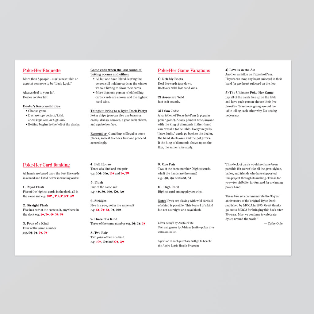 Originally released by MOCA in 1995, Dyke Deck features stylized portraits of Opie’s queer community—friends, lovers, and open-call participants—each suit representing a facet of identity: Couples as Hearts, Jocks as Clubs, Femmes as Diamonds, and Butches as Spades.