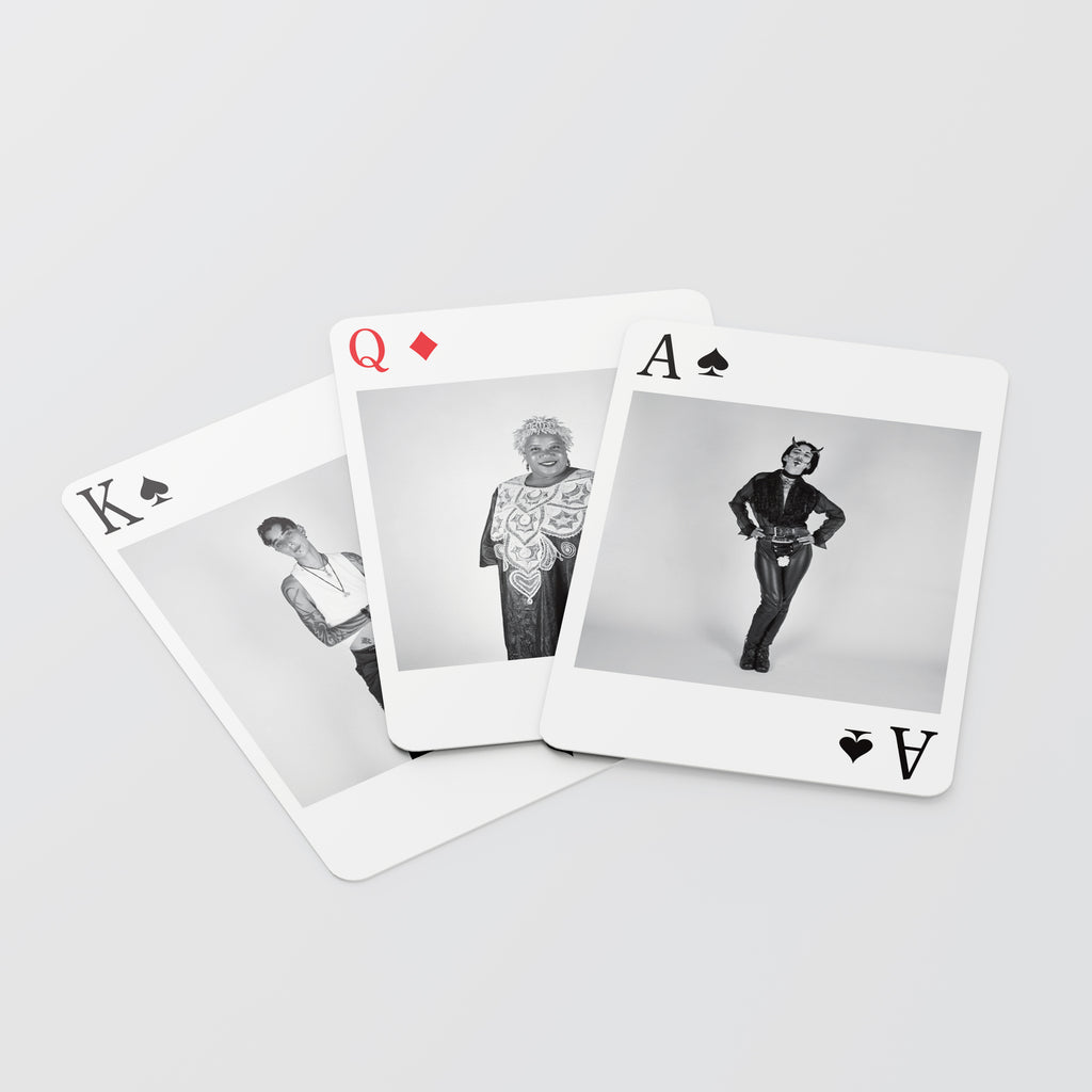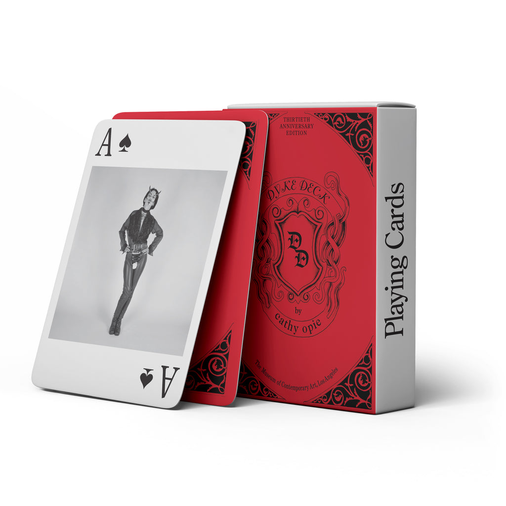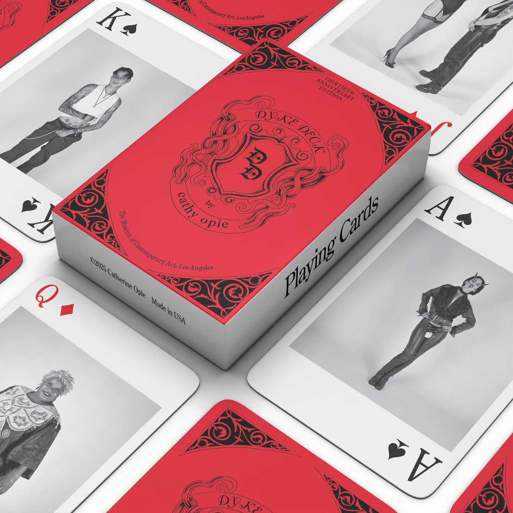 First released by MOCA in 1995, Catherine Opie’s Dyke Deck features highly stylized portraits of the artist’s queer community—both friends and strangers, including participants from an open call in San Francisco. Each suit represents a facet of identity and connection: Couples are Hearts, Jocks are Clubs, Femmes are Diamonds, and Butches are Spades.