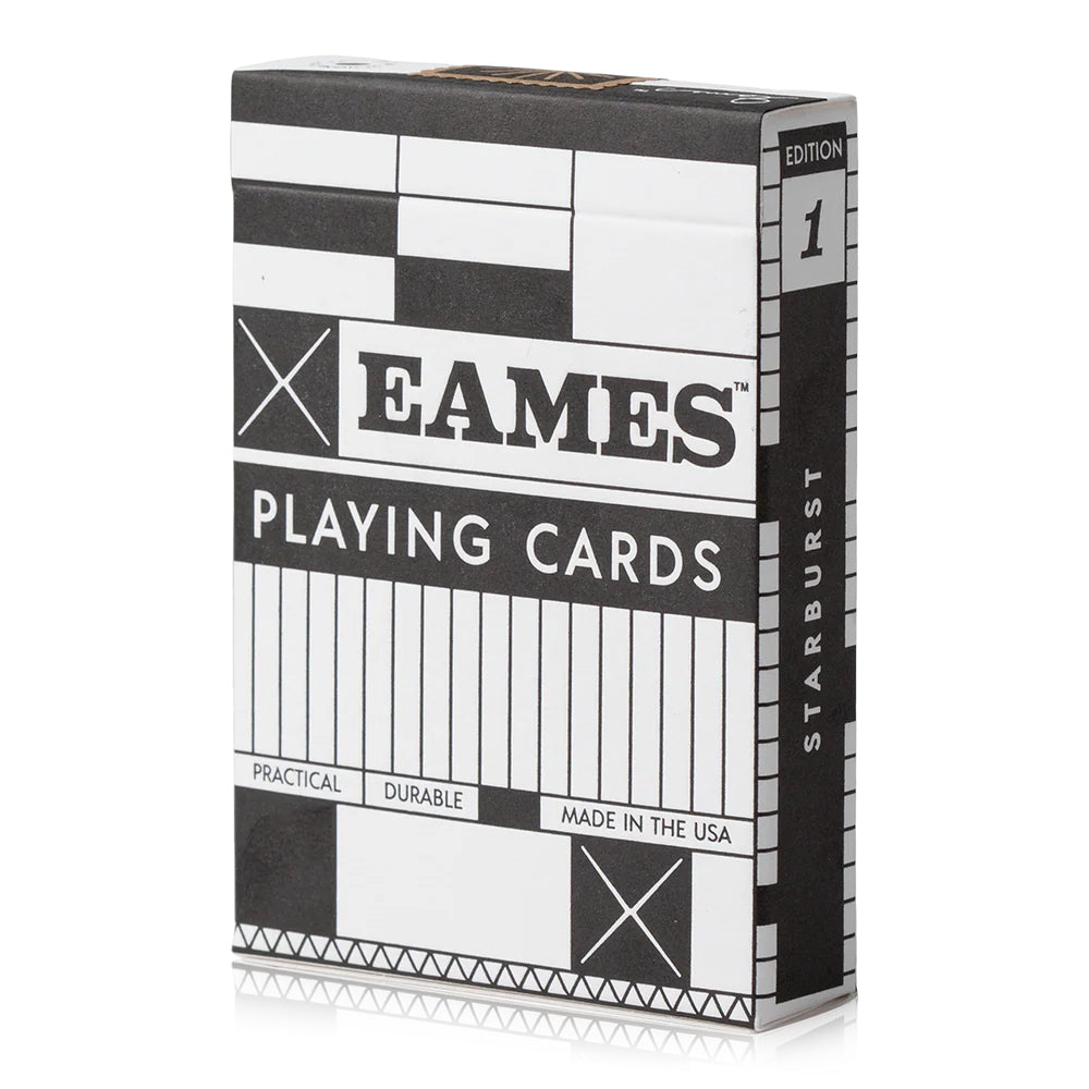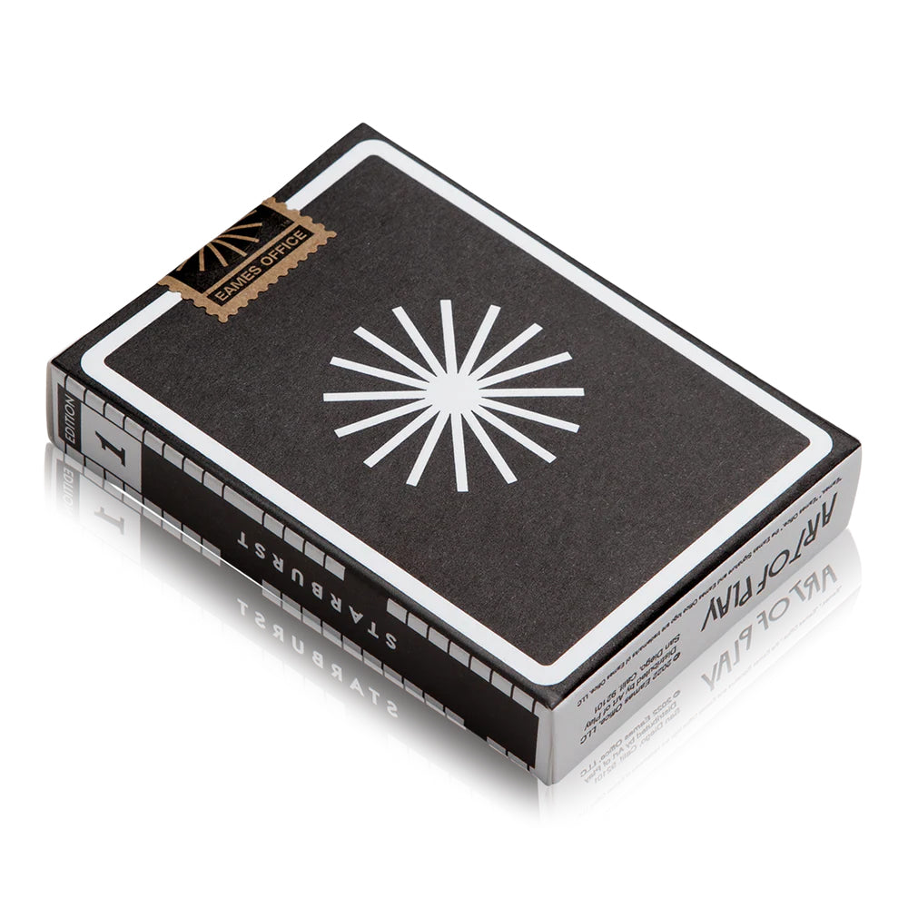 Eames "Starburst" Playing Cards showcase the Eames Office Starburst Logo on the backs. This iconic emblem was a recurring motif in the work of both Charles and Ray. Here it signifies their boundless creative energy—an explosion of light reaching for the outer limits of design's true purpose. The unique numbering system on the faces of the cards enables acts of cardistry to function as subtle homages to the Eameses' classic film “Powers of Ten." The court cards honor the natural majesty they found in elemental geometric shapes. Mathematics, form, and the critical role of constraints in design are threads woven throughout the Eameses' life and work.