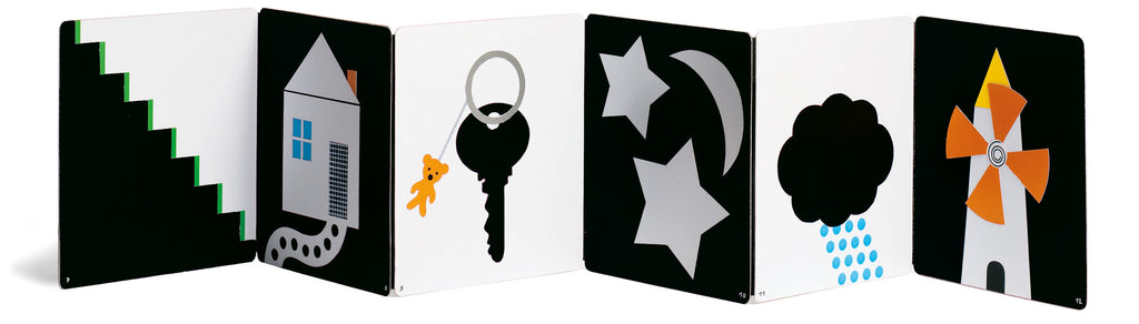 This engaging black-and-white sensory book includes embossed everyday shapes to explore. Let your child trace the shell of a snail or touch the stars. This beautiful fold-out accordion board book is the perfect first board book for babies.
