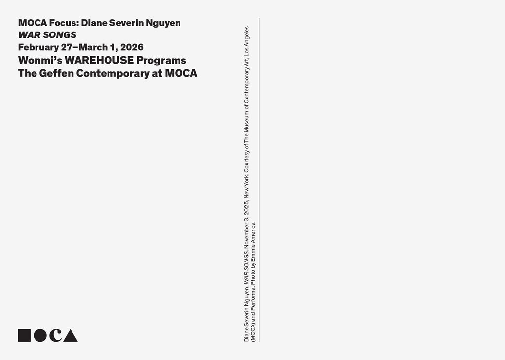 Limited-edition postcard produced for the MOCA Focus: Diane Severin Nguyen WAR SONGS exhibition at The Geffen Contemporary at MOCA, Los Angeles, February 27 – March 1, 2026.