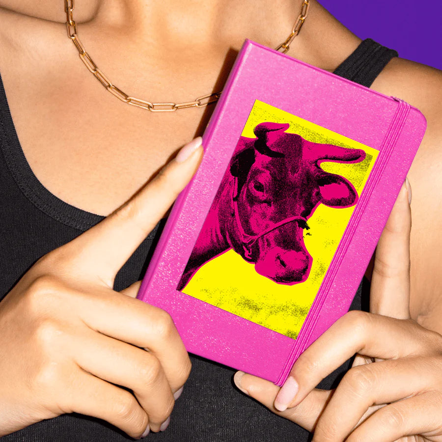 Warhol's cows are famous. Printed in different colorways, he used a repeated pattern of this image for wallpaper that he adhered to gallery walls. This fluorescent pink & yellow version is a classic : )
